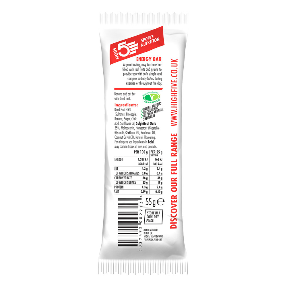 Az High5 Energy Bar banán egy kimondottan versenyzésre fejlesztett energiaszelet, magas szénhidrát-tartalmú, nagyon alacsony zsírtartalommal, és megvan az egyszerű és komplex szénhidrátok egyensúlya, hogy biztosítsa a gyors felszívódást és a hosszantartó hatást egyaránt.