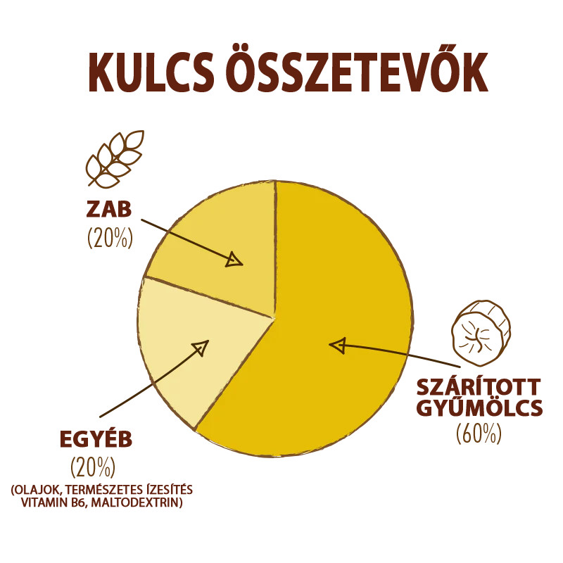 Összetevők: Szárított gyümölcsök 49% (szultán, ananász, banán, cukor, citromsav, napraforgóolaj, szulfitok) Zab 25%, Maltodextrin, nedvesítő (növényi glicerin), Oatbran 2%, napraforgó olaj, kókusz olaj (MCT), természetes aroma.