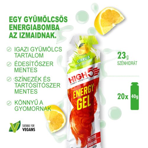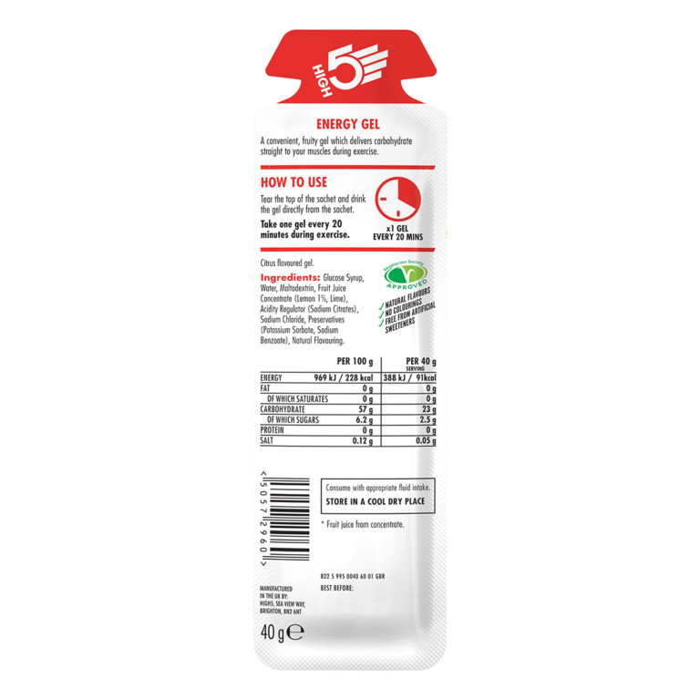 A High5 Energy Gel egy negyedik generációs gél, hígabb állagú, mint a piacon kapható gélek többsége, ezért egyszerű használni. Az Energy Gel nem túl édes, nem túl sűrű, így amikor ki vagy száradva, akkor is könnyű fogyasztani. Az Energy Gel tartalmaz minden alapvető elektrolitet, hogy maximalizálja a folyadék és a szénhidrát-utánpótlást. A High5 Energy Gel ideális energia-utánpótlás azok számára, akik tiszta, természetes forrású energiát szeretnének. Vegetáriánusok is fogyaszthatják, továbbá teljesen mentes bármilyen génmódosított tápanyagtól.