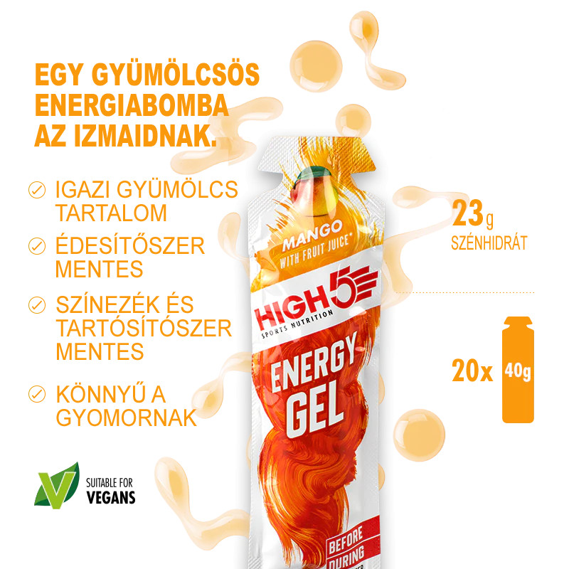 A High5 Energy Gel egy negyedik generációs gél, hígabb állagú, mint a piacon kapható gélek többsége, ezért egyszerű használni. Az Energy Gel nem túl édes, nem túl sűrű, így amikor ki vagy száradva, akkor is könnyű fogyasztani. Az Energy Gel tartalmaz minden alapvető elektrolitet, hogy maximalizálja a folyadék és a szénhidrát-utánpótlást. A High5 Energy Gel ideális energia-utánpótlás azok számára, akik tiszta, természetes forrású energiát szeretnének. Vegetáriánusok is fogyaszthatják, továbbá teljesen mentes bármilyen génmódosított tápanyagtól.
