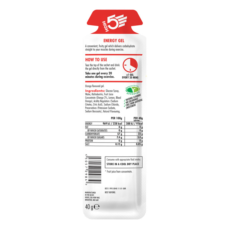 A High5 Energy Gel egy negyedik generációs gél, hígabb állagú, mint a piacon kapható gélek többsége, ezért egyszerű használni. Az Energy Gel nem túl édes, nem túl sűrű, így amikor ki vagy száradva, akkor is könnyű fogyasztani. Az Energy Gel tartalmaz minden alapvető elektrolitet, hogy maximalizálja a folyadék és a szénhidrát-utánpótlást. A High5 Energy Gel ideális energia-utánpótlás azok számára, akik tiszta, természetes forrású energiát szeretnének. Vegetáriánusok is fogyaszthatják, továbbá teljesen mentes bármilyen génmódosított tápanyagtól.