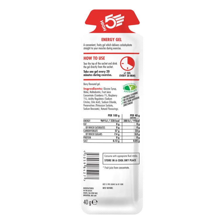 A High5 Energy Gel egy negyedik generációs gél, hígabb állagú, mint a piacon kapható gélek többsége, ezért egyszerű használni. Az Energy Gel nem túl édes, nem túl sűrű, így amikor ki vagy száradva, akkor is könnyű fogyasztani. Az Energy Gel tartalmaz minden alapvető elektrolitet, hogy maximalizálja a folyadék és a szénhidrát-utánpótlást. A High5 Energy Gel ideális energia-utánpótlás azok számára, akik tiszta, természetes forrású energiát szeretnének. Vegetáriánusok is fogyaszthatják, továbbá teljesen mentes bármilyen génmódosított tápanyagtól.