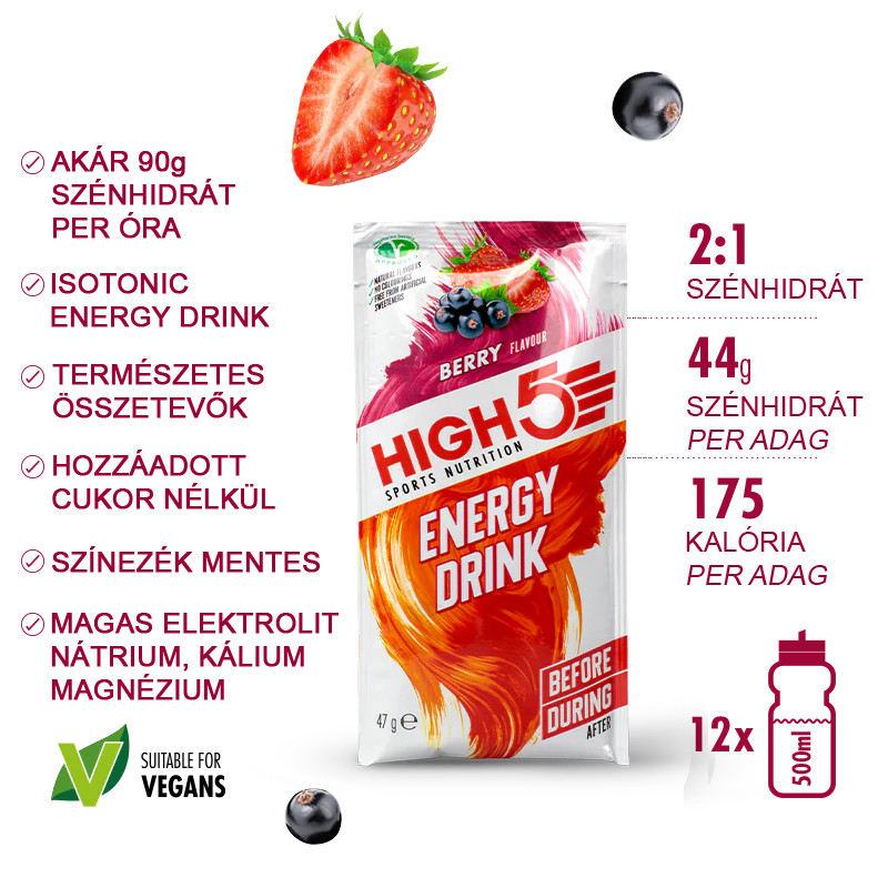 A High5 Energy Drink egy tudományosan megalkotott 2:1 arányú szénhidrát- és elektrolit ital, amely segít fenntartani a teljesítményt és fokozza a hidratáltságot az állóképességi sport során. Köztudott, hogy a szénhidrát a legalkalmasabb üzemanyag a sportoláshoz. Gyorsabbá tesz, kitartást ad és élvezhetővé teszi a sportot. Sajnálatos módon azonban a szervezet szénhidrátraktára viszonylag kicsi és gyorsan kimerül edzés vagy versenyzés alatt.
