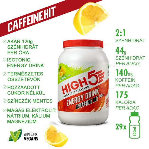 A High5 Energy Drink Caffeine HIT egy tudományosan megalkotott 2:1 arányú szénhidrát- és elektrolit ital, és adagonként 140mg koffeinnel, amely segít fenntartani a teljesítményt és fokozza a hidratáltságot az állóképességi sport során.